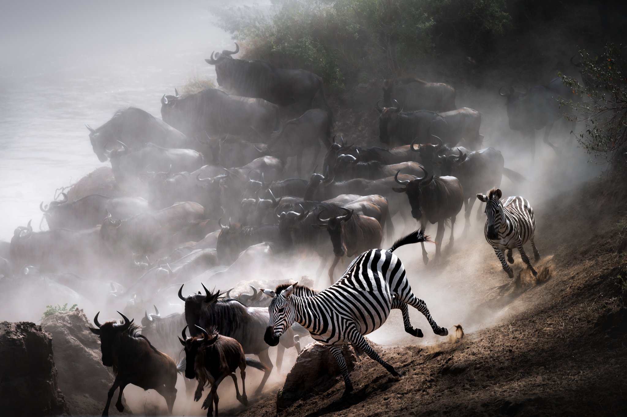 Stripes blur into hooves and dust. The Great Migration in one frame.